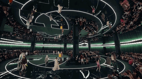 从米兰的街巷步入Gucci 2025秋冬时拆秀现场,秀场被打制为一个的空间,脚下,互扣式双G(Interlocking G)标识沿地面铺展,深绿色的纹理现约浮现,意味着品牌半个世纪以来的传承取演变——过去取现正在,正在这里交汇。
