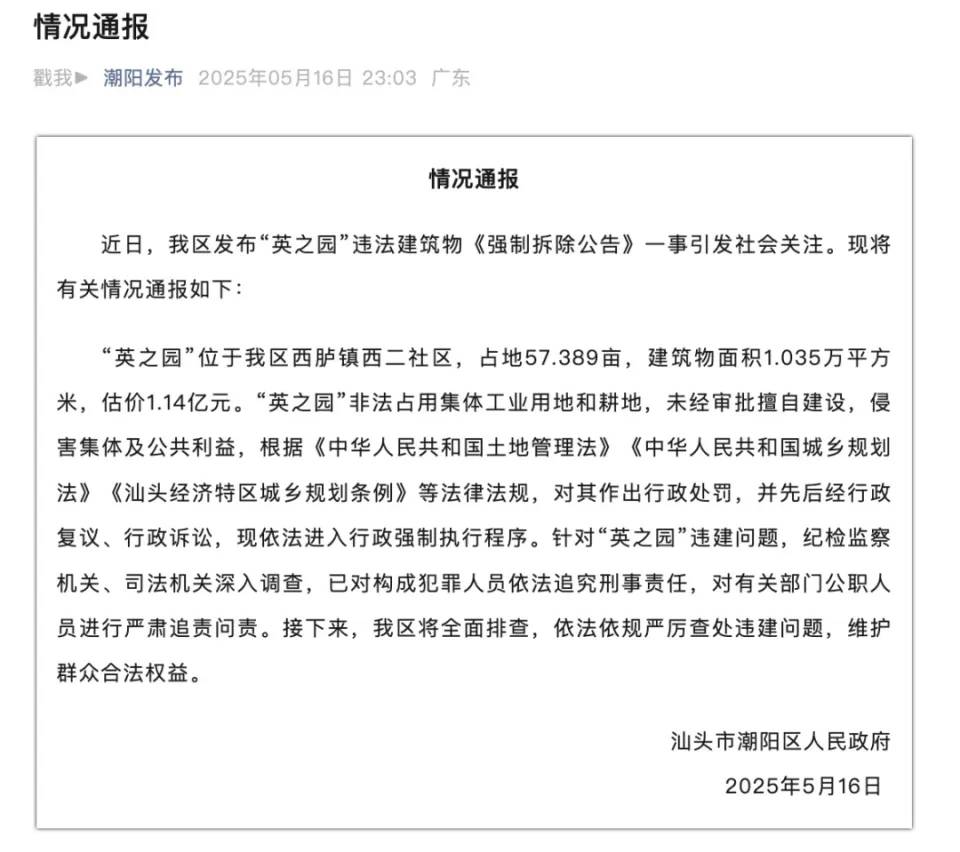 按照《汕头市违法扶植分类措置指点看法》对于违法违规的现实环境,凡是是用拆除、、收管三种体例施行,对于英之园的非遗价值也是有考虑,由村集体办理的;可是被三兄弟的父亲陈英彪了,期间不竭用诉讼迟延时间,多次沟通无果才下达拆除的,终究法律王法公法面前不容;