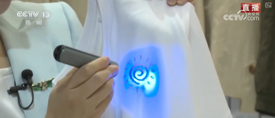 这件儿童T恤上的小太阳印花,采用“光感纱线”制做,摸起来并没有分歧,可是当用紫外线灯光映照后,儿童正在户外勾当时,能够提示家长及时给孩子做好防晒。如许的变色图案也多了几分童趣。