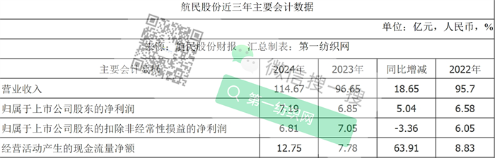 第一纺织网4月3日动静(记者martin报道):浙江航平易近股份无限公司(以下简称“航平易近股份”)日前披露2024年年报,演讲期内,公司实现停业收入114。67亿元,取上年同期的96。65亿元比拟增加18。65%,停业收入冲破百亿后创汗青新高,归属于母公司的净利润7。19亿元,取上年同期的6。85亿元比拟增加5。04%,接近恢复至2019年净利润7。37亿元程度。