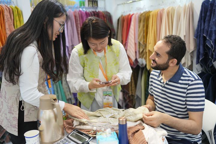 一名来自埃及的客商正在2024中国绍兴柯桥国际纺织品面辅料博览会(春季)上选购面料(2024年5月6日摄)。记者 翁忻旸 摄“深耕‘一块布’,柯桥纺织持续。”浙江布创纺织集团总司理钱水江说,专注提拔印染手艺、时髦设想、财产链协划一,让保守纺织业块状经济不竭焕发朝气。目前,浙江规上工业企业跨越5万家,停业收入冲破11万亿元,“中国平易近营企业500强”数量稳居全国第一,块状经济成为先辈制制业高质量成长的主要依托和经济转型升级的主要支持力量。