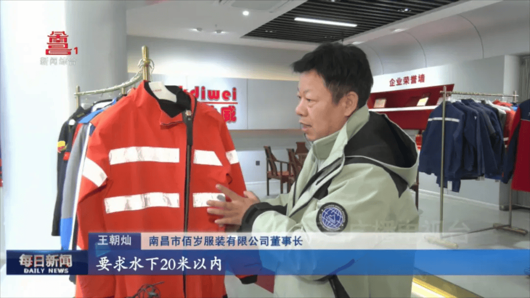 南昌市佰岁服拆无限公司董事长王朝灿:“通过缝制加黏合的体例,起到防渗水的感化,要求水下20米以内,渗水不克不及跨越200克,面料是采用阻燃面料。”。